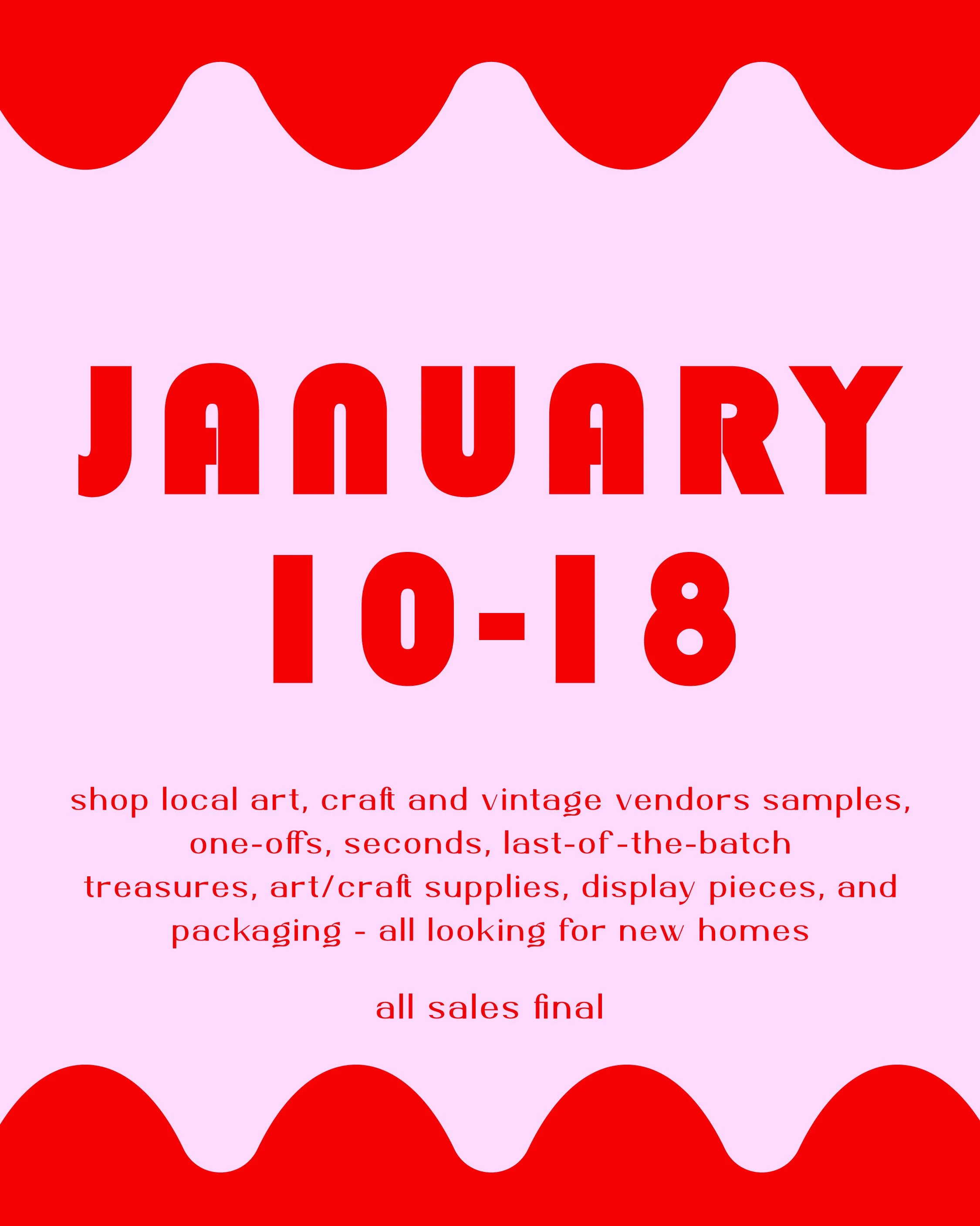 Our shop doors will open Jan 10-18 for a special ๐๐ป๐ฑ ๐ผ๐ณ ๐ฆ๐ฒ๐ฎ๐๐ผ๐ป ๐ฆ๐ฎ๐น๐ฒ! Local art, craft and vintage vendors will have samples, one-offs, seconds, last-of-the-batch treasures, art/craft supplies, display pieces, and packaging - all looking for new homes.