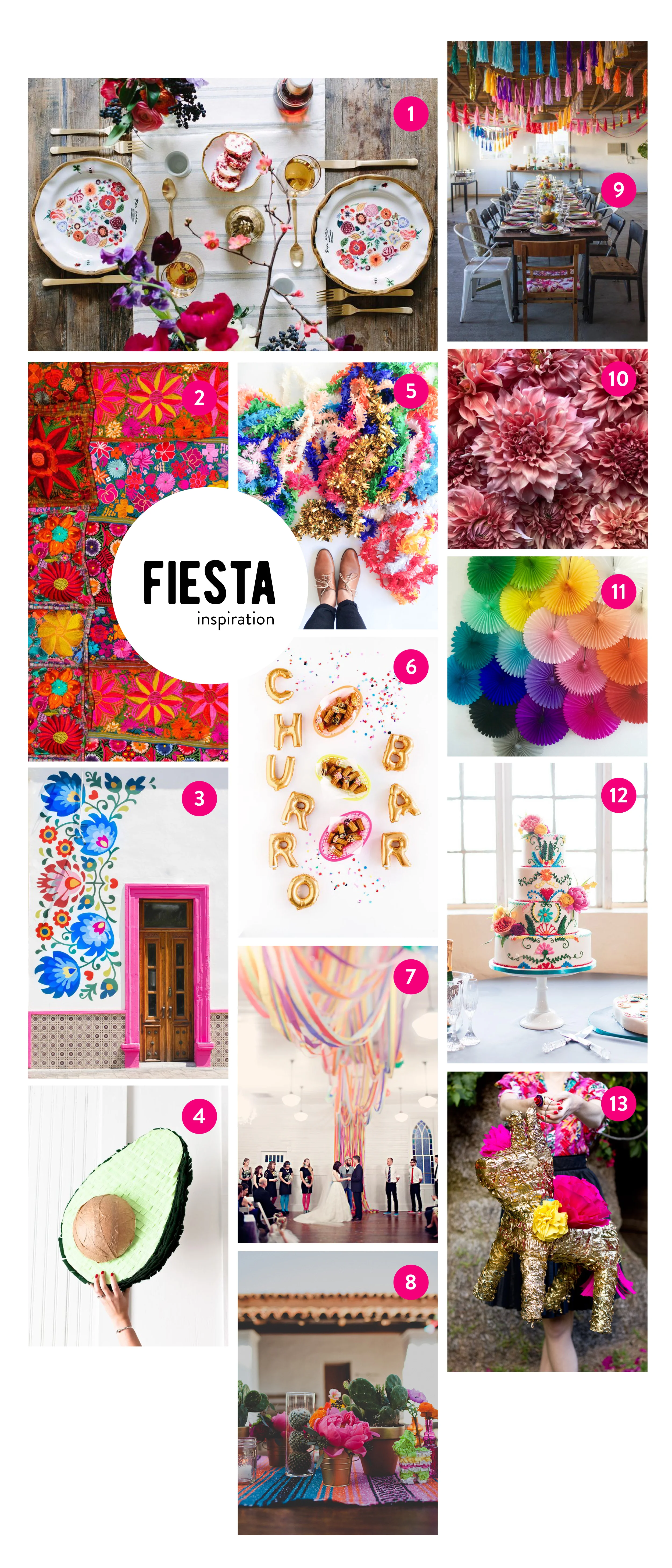 1. Gilded Tablescape | Mary Costa 2. Guatemalan Textile | Jimena Cricket 3. Floral Mural & Pink Door | Victor Hernandez 4. Avocado Pinata | Healthfully Ever After 5. Festive Festooning | Oh Happy Day 6. Churro Bar | Kara's Party Ideas 7. Glitter Rainbow Wedding | Green Wedding Shoes 8. Tablescape | 100 Layer Cake 9. Tassel Garland | Geronimo via Level 10. Dahlias | Blue Ridge Blooms 11. Tissue Paper Fans | PomLove 12. Colorful Fiesta Wedding | Ruffled 13. DIY Gilded Pinata | Studio DIY